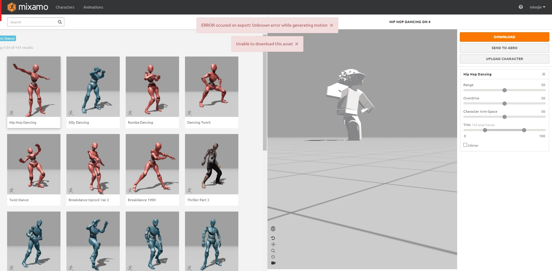 Mixamo Exporting Unknown Error