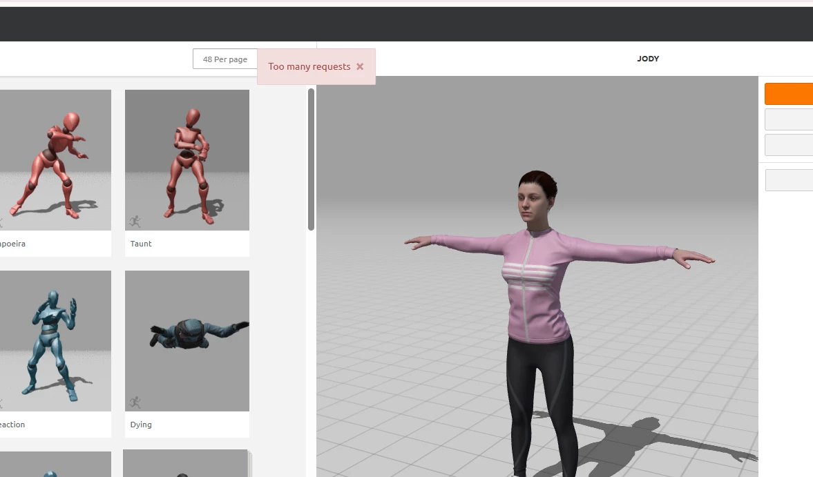 Sshertoy_5505ParticipantForum|Forum|8 months agoJune 18, 2025QuestionMixamo not wokingForum|Forum|8 months agoJune 18, 20250 replies77 viewsI get "Too many requests" error when trying to download animations. So the site is not down, but I get errors, which I never experienced before on Mixamo.Bug