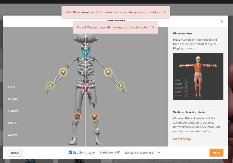mixamo place all markers on character error