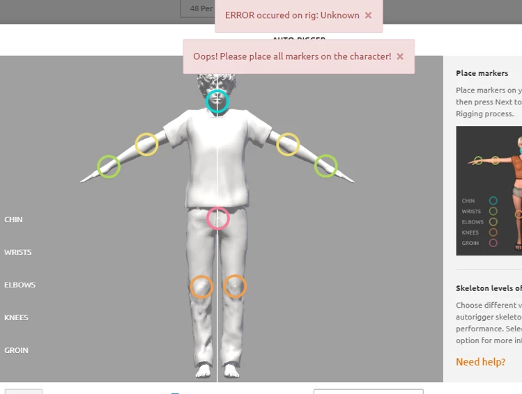 hello. I'm fairly new to Blender and Mixamo. I'm trying to rig a character to be used in a personal project I'm working on to learn a bit more in different programs. When I try to rig the model in Mixamo I get this message. I've tried turning off symmetry, tried converting the file through Autodesk and the internet, removed materials. I do not understand what the problem is. I have also tried having the model in different sizes. Anything from 5mb to 20mb to 50mb to 80mb. Is there anyone who can help me?