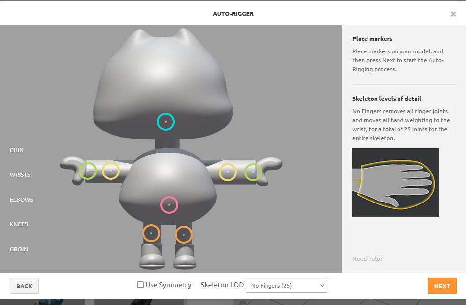 - to get it to rig i would even out the arms, center the model, turn off symmetry, select no hands and add a neck