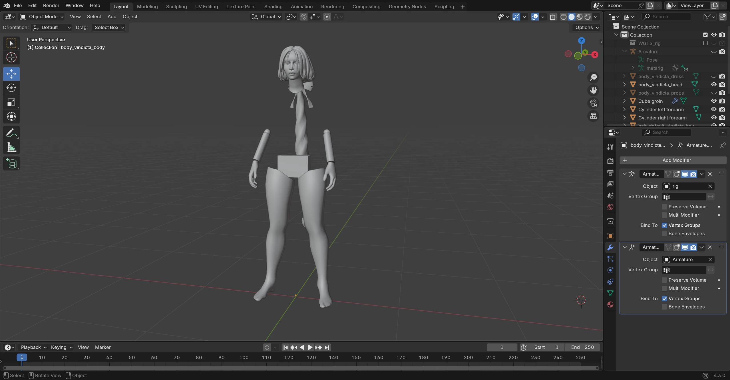 Hello everyone! I recently started Blender a couple of days ago and found myself to hit a wall. The model I chose doesn't seem have a lot under her dress. Mixamo asks for elbow and groin markers so I thought maybe it would work if I add objects as markers when the dress itself doesn't work. I'm unsure how all parts have to be attached together: