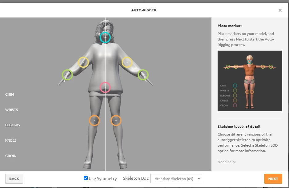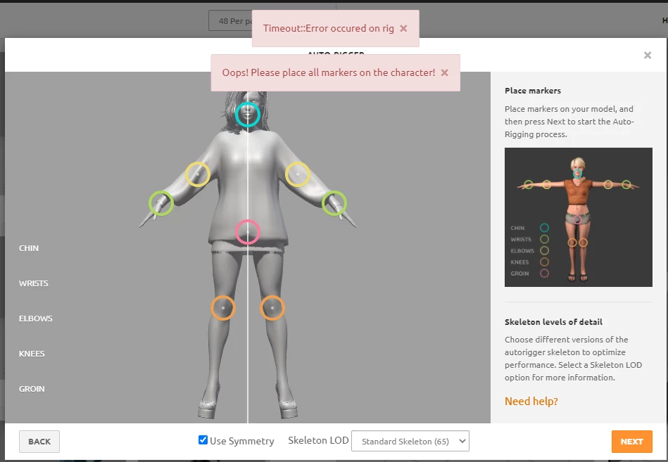 The problem is that the autorigger that places bones gives an error like "Put all the markers on the character", although I am sure that I did everything correctly and tried to fill in 100 times in 3 days in different ways (I also changed the placement of markers).