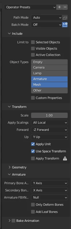 I've followed the settings for most threads.  Here are the settings I'm using for the FBX export: