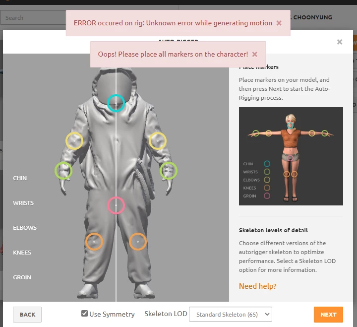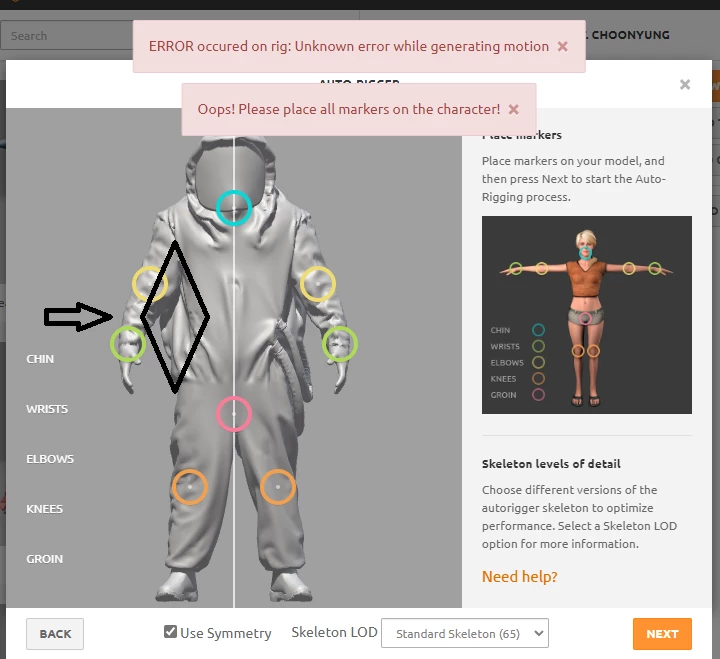 I am trying to auto rig a character that I bought for blender. Whenever I put all the points on all the right spots on the character and click next a message appears. "Error Occured on rig: Uknown Error while generating motion. Oops! Please place all markers on the character. Anybody know how I can fix this?