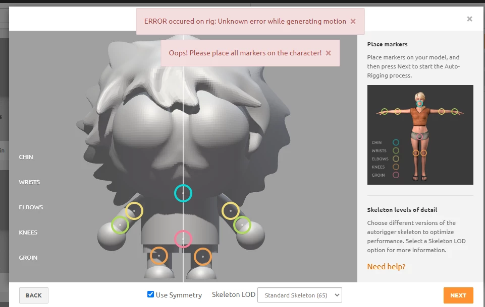 "Unknown Error while generating motion" & "Place al markers on the character" always appearing