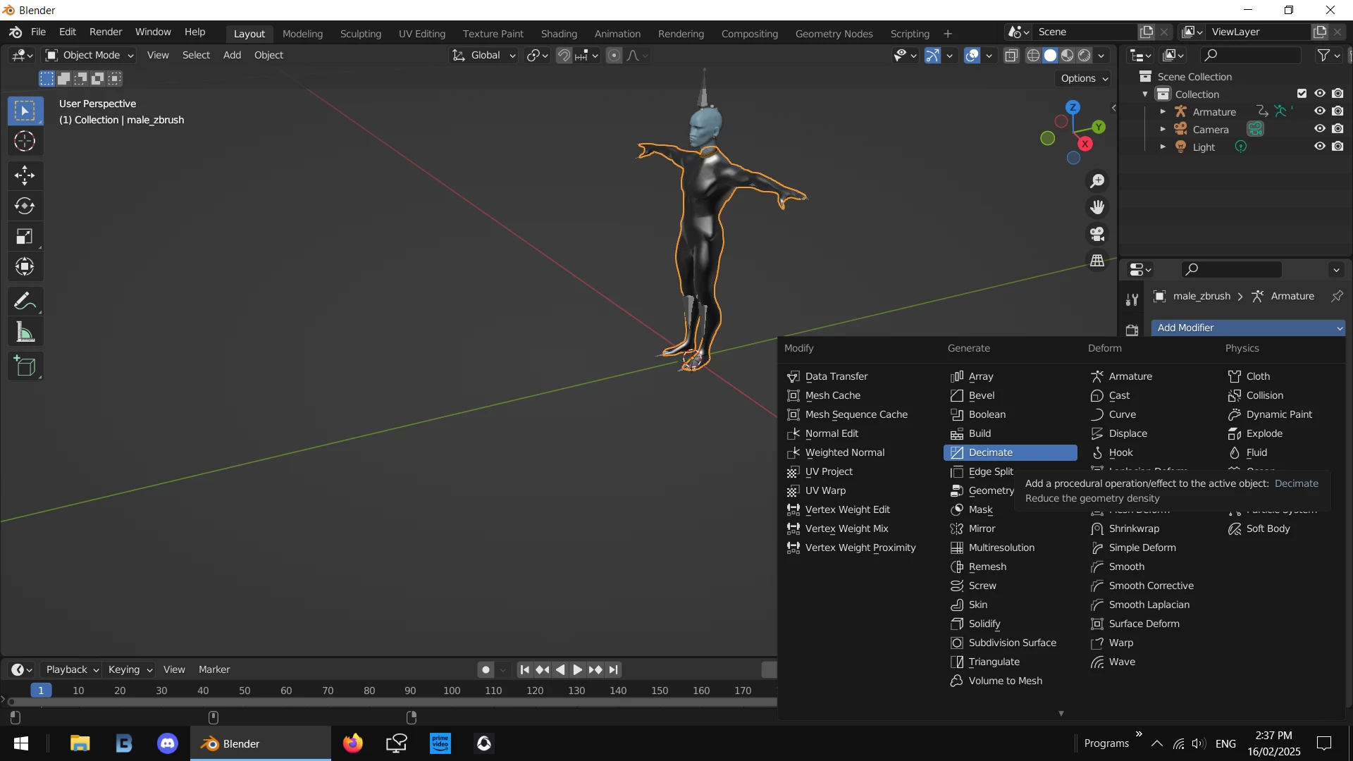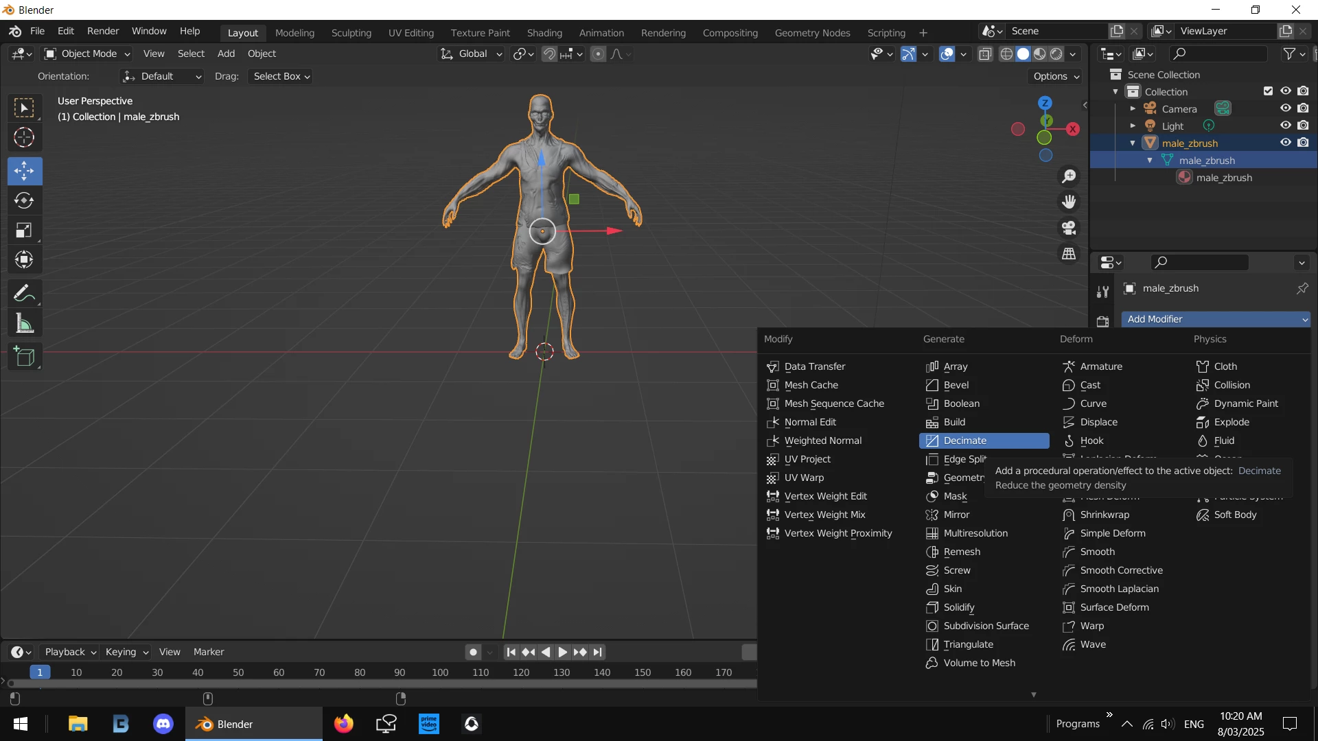 in this case your model is in two parts [body + head] i ran a .50% on the bidy 3 times so 1/2, 1/4 then 1/8 and then i also "decimated" the head .50 once... i did more on the body because i consider the head more important for close ups but if you fine the model distorts while moving around you could 'decimate' the head 3 times instead and the body once