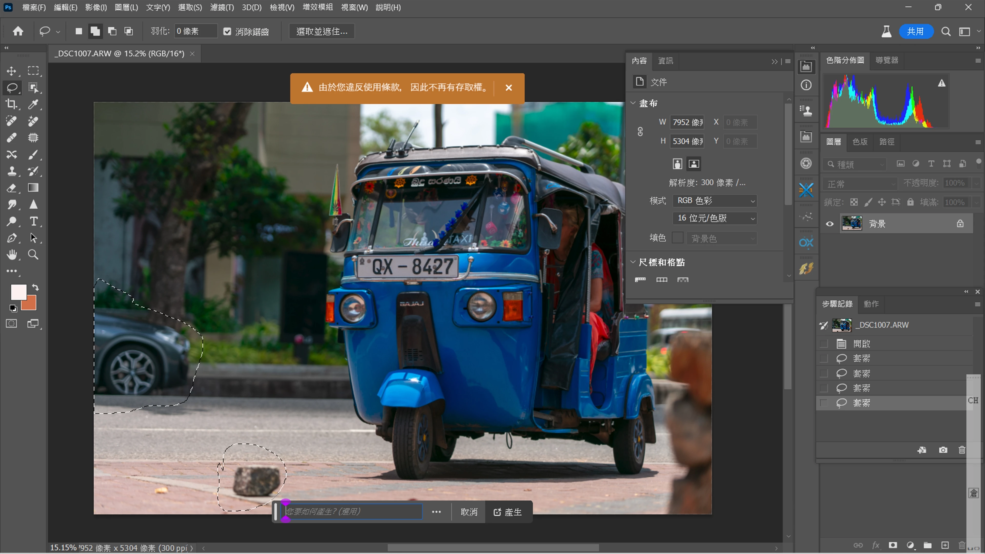 我使用Photoshop 25.1 中的生成填充功能。然而,由於持續出現使用者指南違規警告,該功能基本上無法使用。當我使用生成填充時,就會發生這種情況。我主要用它來評估它在照片修復過程中的效果,但基本上它不可用。