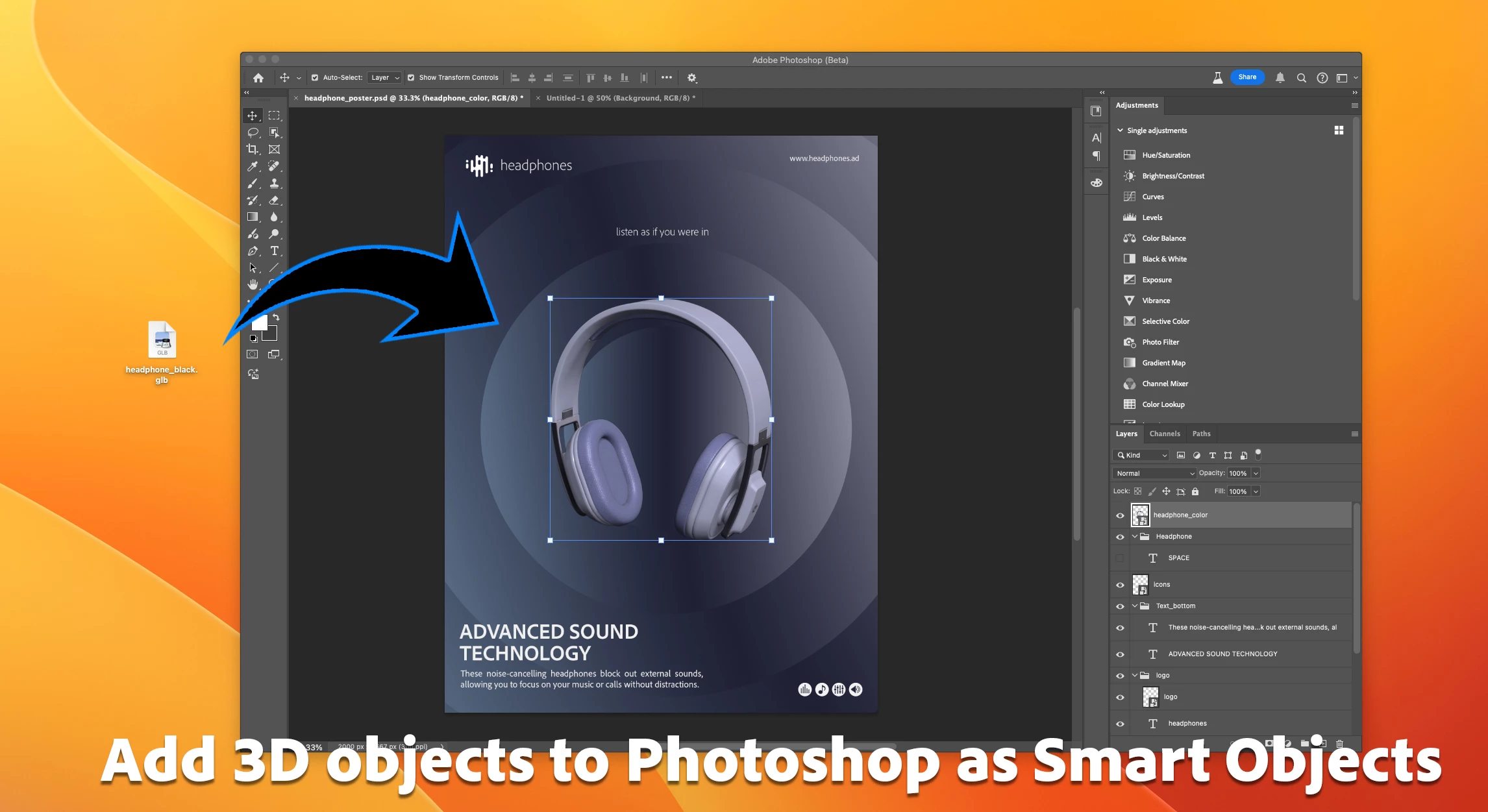You can now add 3D objects to Photoshop (Beta). Substance 3D Viewer will provide a render of the object and then the 3D file is embedded in your document as a Smart Object layer.