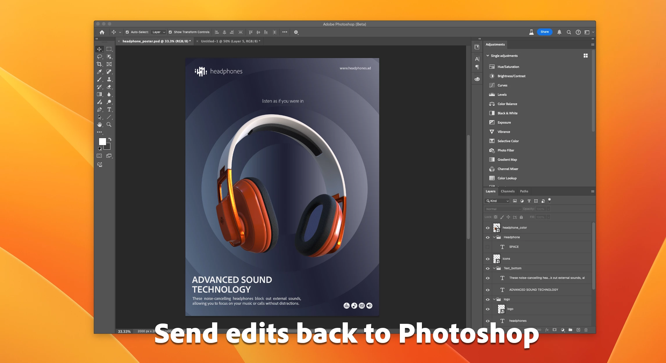 When you're done use the "To Photoshop" button to easily send your edits back to Photoshop and update the embedded 3D file! Iterate or send the file to others, incorporate your 3D object like any other layer in your 2D designs with masks, adjustments, and other effects.