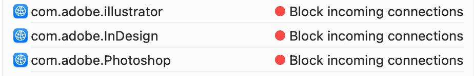 Adobe Illustrator, InDesign and Photoshop all have incoming connections blocked and have no toggle switch to change it.