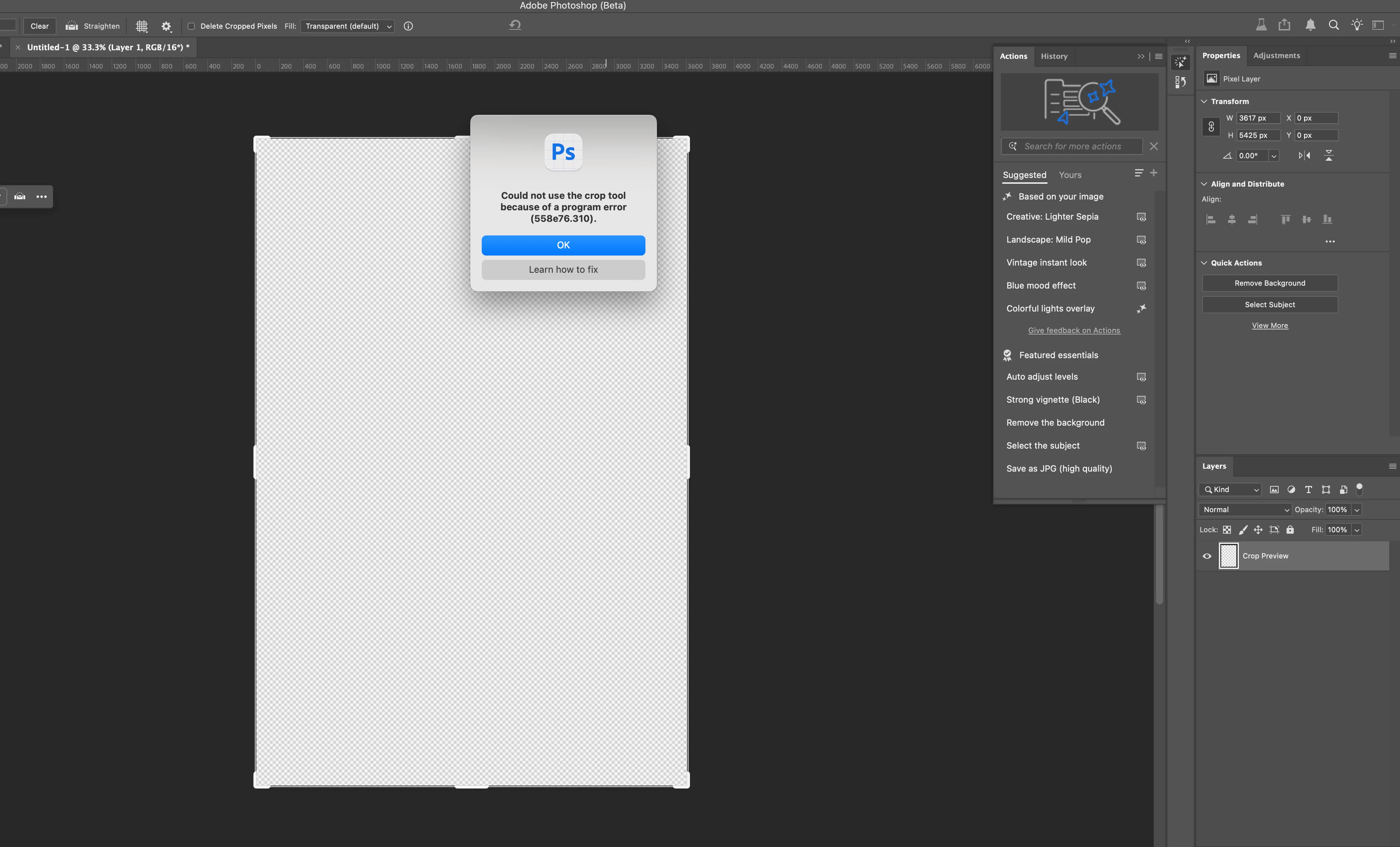 Any ideas about how to fix this issue, if possible? Obviously, not being able to crop kind of kills my projects in the beta and I'll have to return to the release version of PS.