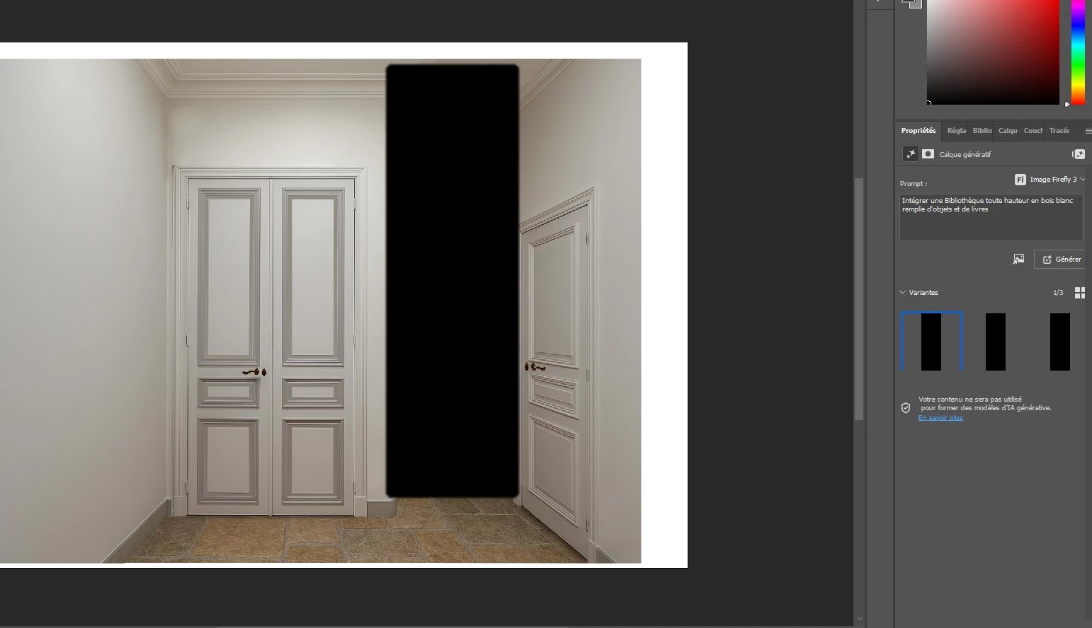 Depuis 1 semaine, lorsque j'utilise le remplissage génératif dans Photoshop Beta, les 3 résultats sont uniquement des rectangles noirs.