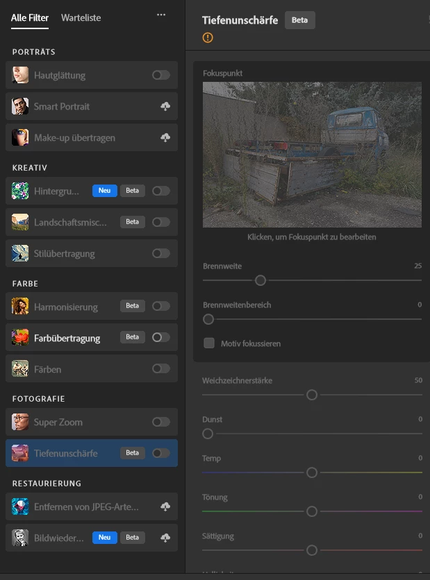 Hi everyone, I can't use the Neural Filters in Photoshop. The window containing all the filters opens, but after downloading and trying to use them, I get an orange exclamation mark. The filter sliders, for example, for Depth of Field, can't be activated. I'm using the latest beta version. Deleting all filters or even uninstalling Photoshop didn't help. Do u have any idea?