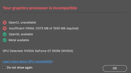 I have MacBook Pro with 16GB RAM and 500 GB of storage, along with fast Wifi. Everytime I turn on Beta, I get this message (Your grapics proessor is incompatible. OpenCL unvailable, insufficient VRAM.