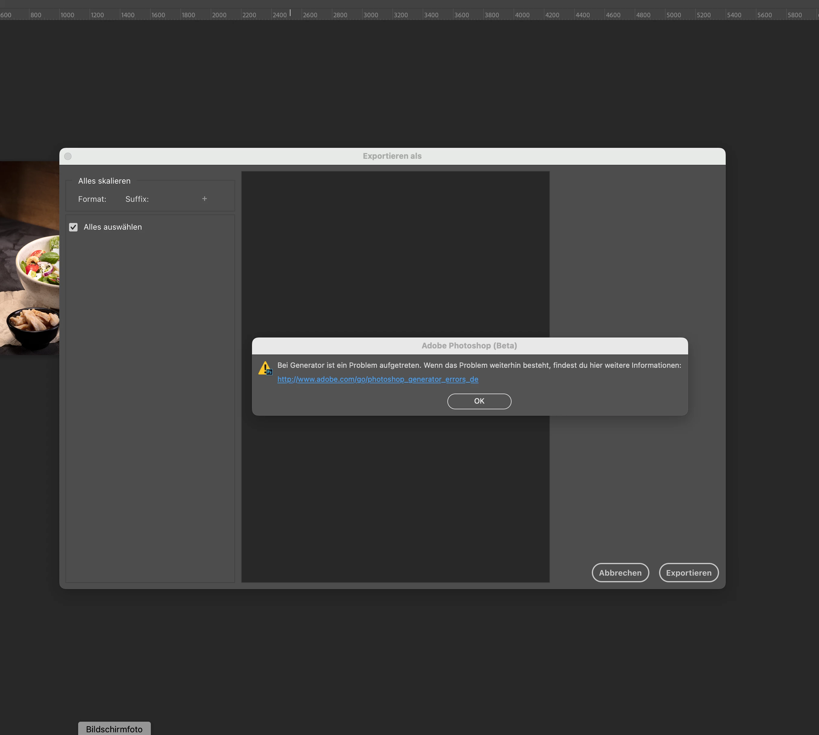 Seit ein paar Tagen kommt die Fehlermeldung beim Öffnen PS (Beta) und beim Datei > Exportieren als > Bei Generator ist ein Problem aufgetreten. Wenn das Problem weiterhin besteht, findest du hier weitere Informationen: http://www.adobe.com/go/photoshop_generator_errors_de