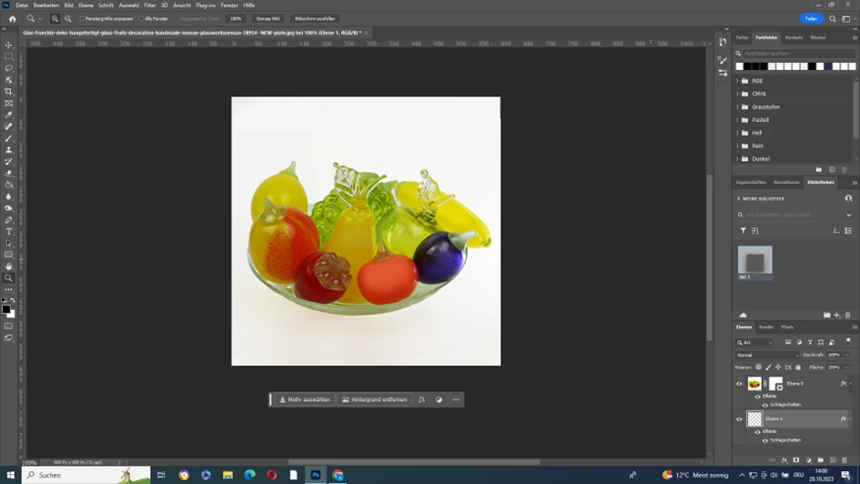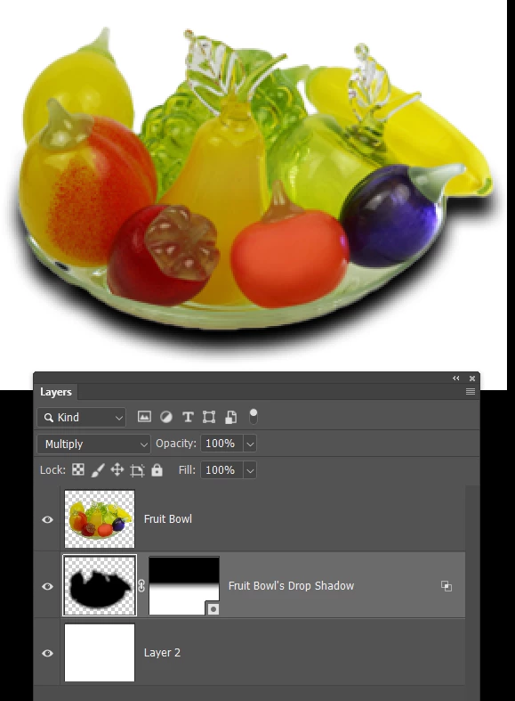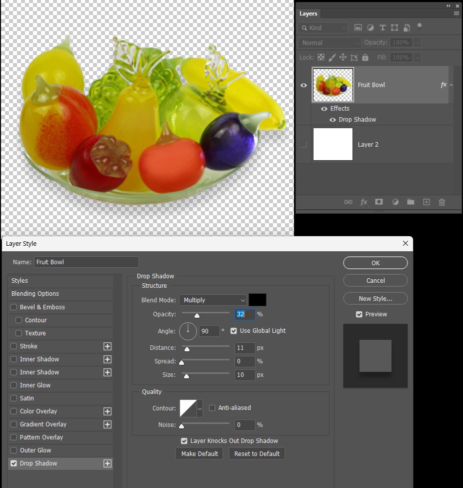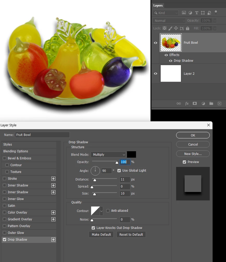 As Kevin has said, the fruit bowl layer appears to completely fill the document so a Layer Style > Drop Shadow would be applied outside the canvas, which is a nonsense, The bowl's background needs to be transparent. That way the drop shadow will be applied directly to the outside of the bowl.