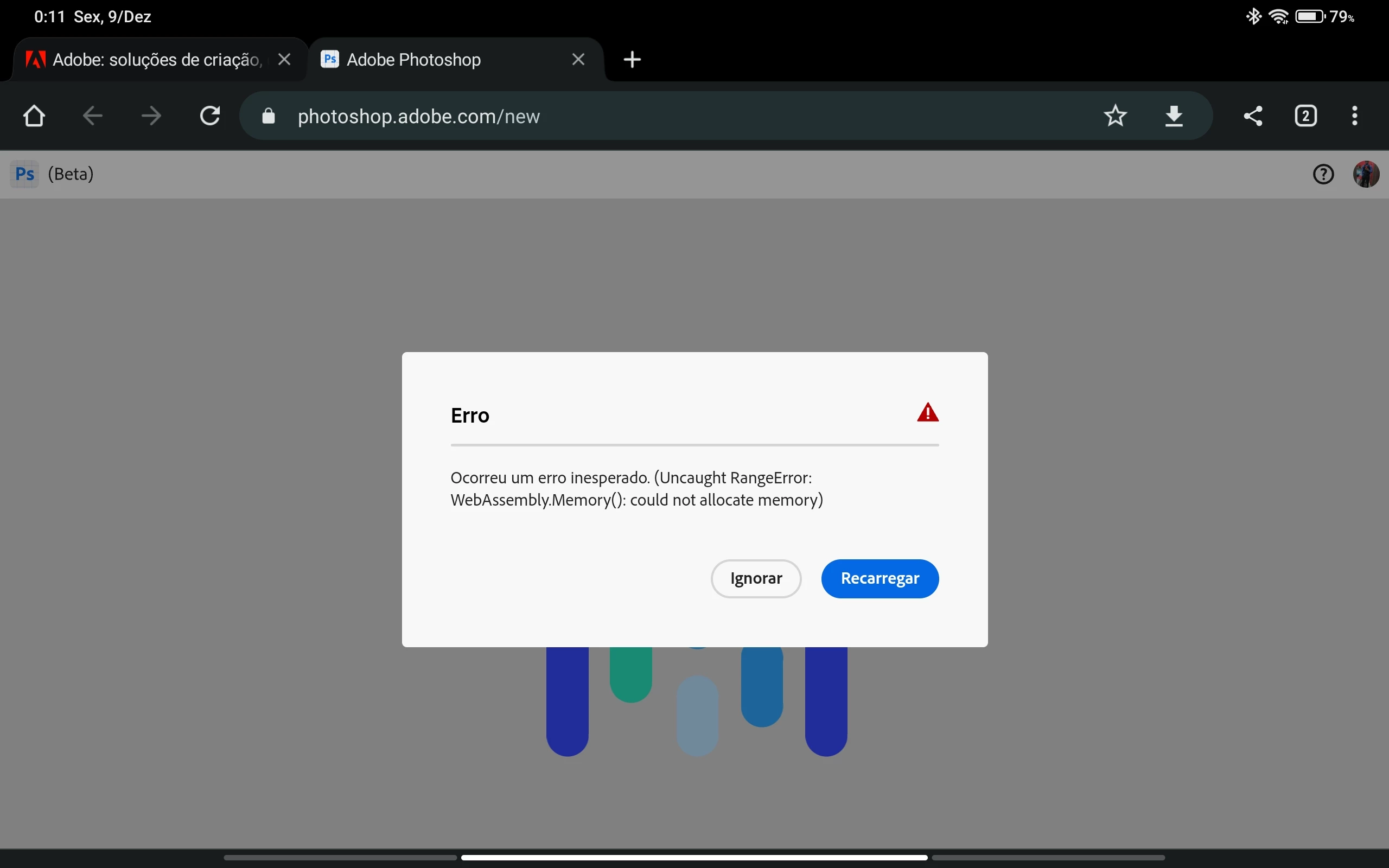 meu photoshop beta online esta com um erro, porem o erro so acontece no navegador do meu tablet