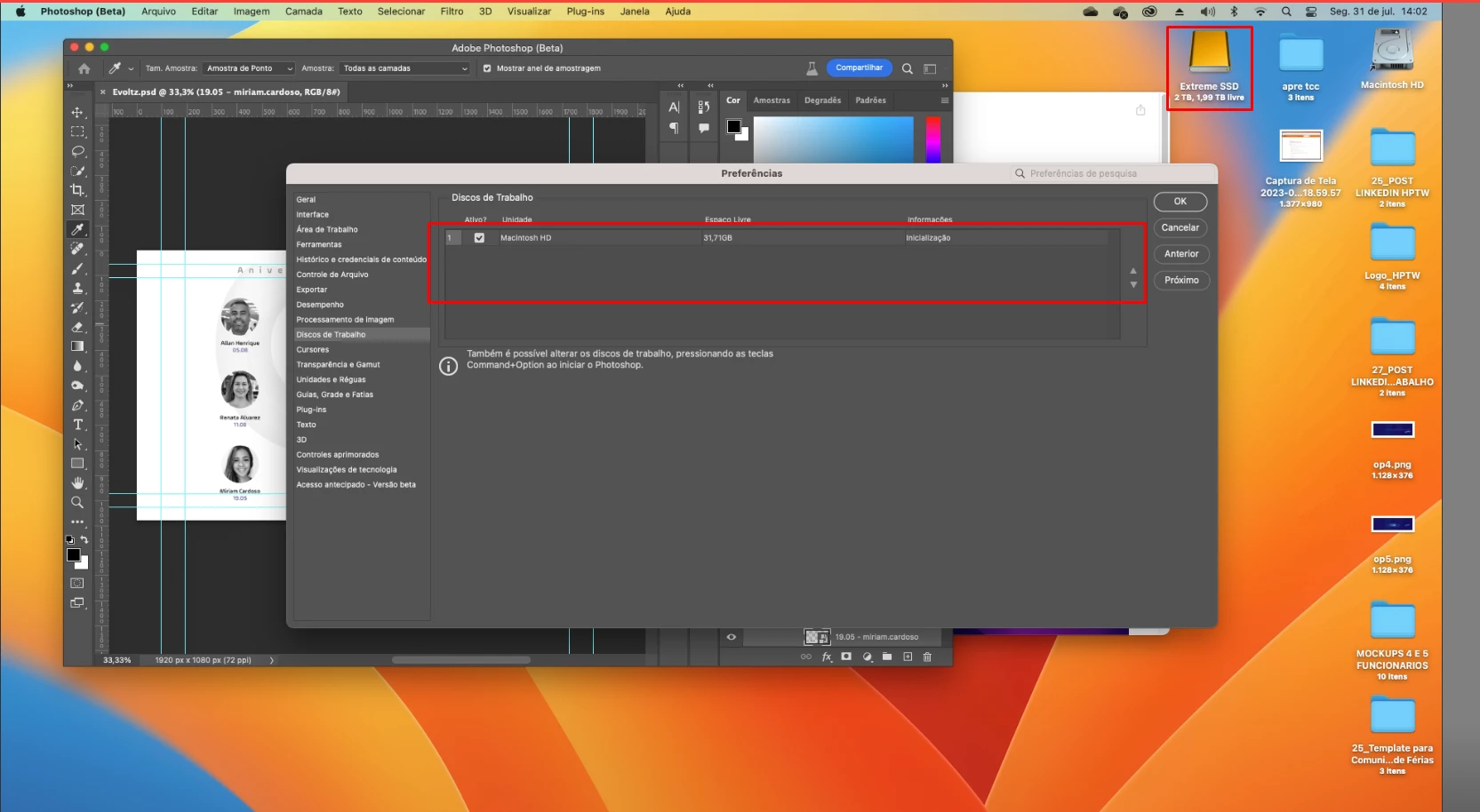 Néctar ComunicaçãoParticipantForum|Forum|2 years agoJuly 31, 2023QuestionErro - Reconhecimento de SSD externo.Forum|Forum|2 years agoJuly 31, 20231 reply289 viewsBoa tarde pessoal, Poderiam nos ajduar ? Fiz uma compra de um SSD externo para meu MAC. Foi instalado e esta em funcionamento. Porem quando abro o photoshop o mesmo nao é reconhecido na aplicação. Para colocar o mesmo como um aramazenamento principal. Poderiam me ajudar ? Obrigado!!!Desktop-macOS