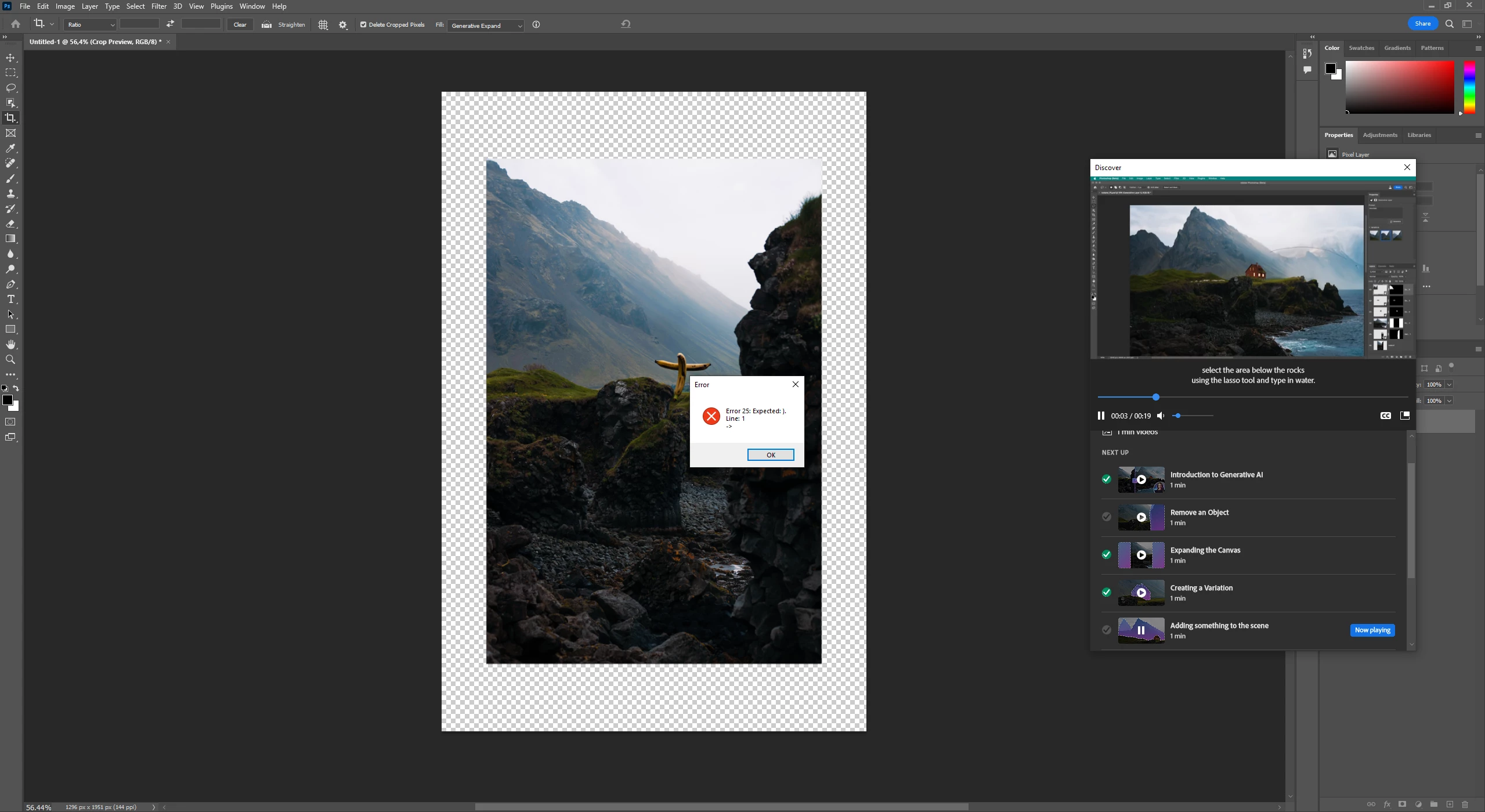 Everything is latest version, I'm doing exactly the same what lesson video does and it makes error. It says crop>choose generative fill (which it isnt let me choose) and when i try to generative expand this happens