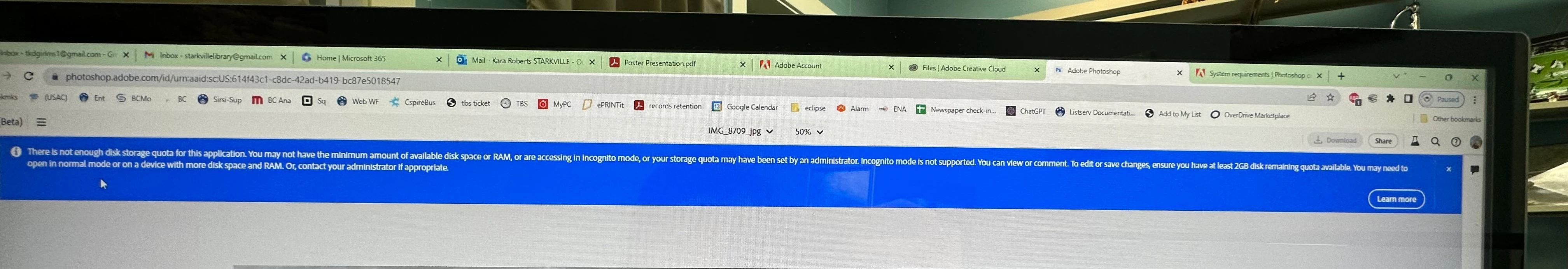 I got the message in the attached picture and it doesn't apply to my computer. Everything mentioned in the error is incorrect as I have a brand new computer with 16 gb ram, Win 11, Intel processor supporting 64 bit, my Chrome is v. 114.0.573 and I'm not using incognito. I can't think of any reason why it won't open a picture on the web version.
