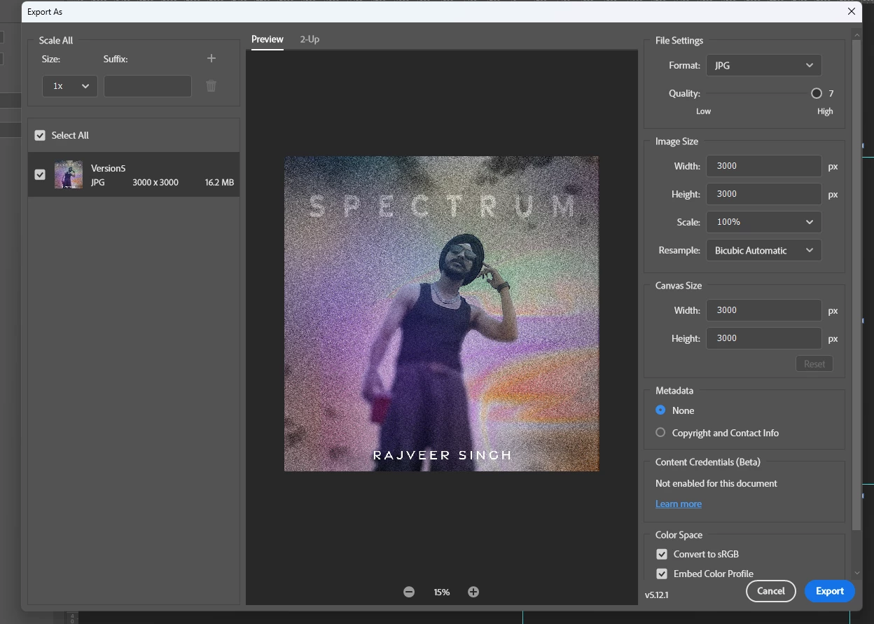 I am sharing the screenshots of the bug in my photoshop beta version 2025, it's very irritating the adobe softwares are getting full of bugs on every new update. The canvas shows what i designed actually but the export screen is showing dull colors and after export the jpg is the dull in colors. same is happening with png also.