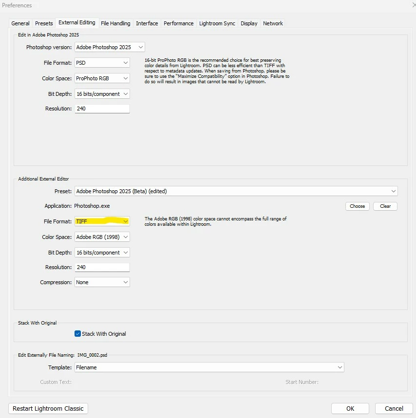 When I do an external edit from Lightroom Classic to PS(Beta) I get an error (see image attatched) I have tracked this down to the external file type set in LRC preferences to Tiff rather than PSD. Strangely PS(Beta) creates a PSD file which is passed back to LRC. Setting the preference file type to PSD is fine and both file types work fine on the non Beta Photoshop 2025 .