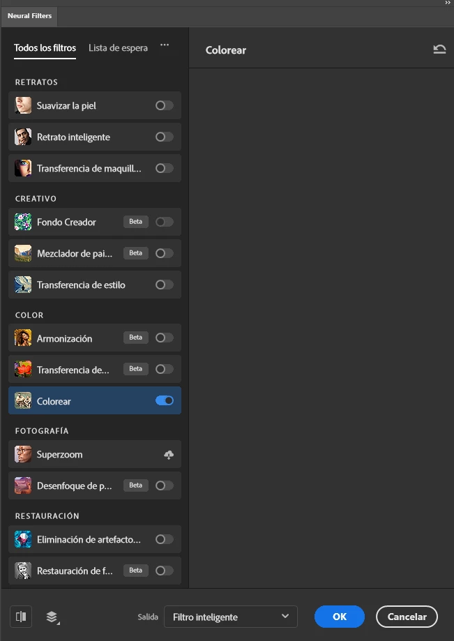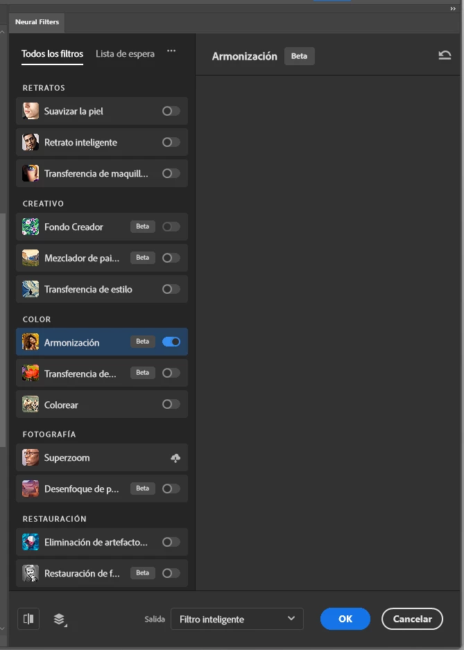 Buenas noches, he realizado la actualización de photoshop Beta 26.3 y en Ajustes de Filtro Neural Filters no me deja realizar la acción, es decir por ejemplo le doi para armonizar y no salen los ajustes debajo para suavizar o selecionar la capa que quiero.