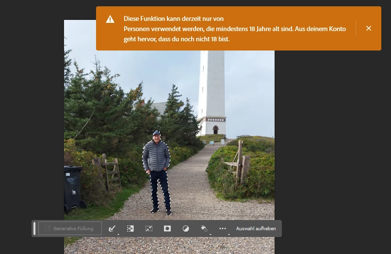 Why is the Generative Fill button not available? If you find that Generative Fill is greyed out for you, it is possible that you may not have a valid Date of Birth associated with your Adobe ID account. To update your Date of Birth, you can do any of the following: • Log into Behance with your Adobe ID and enter your Date of Birth. • Log into your Adobe account and enter your Date of Birth. To learn more, see Error: "Not eligible to use Creative Cloud services". Once your Date of Birth is up to date, relaunch the Photoshop (beta) app to enable Generative Fill. https://helpx.adobe.com/photoshop/using/generative-fill.html