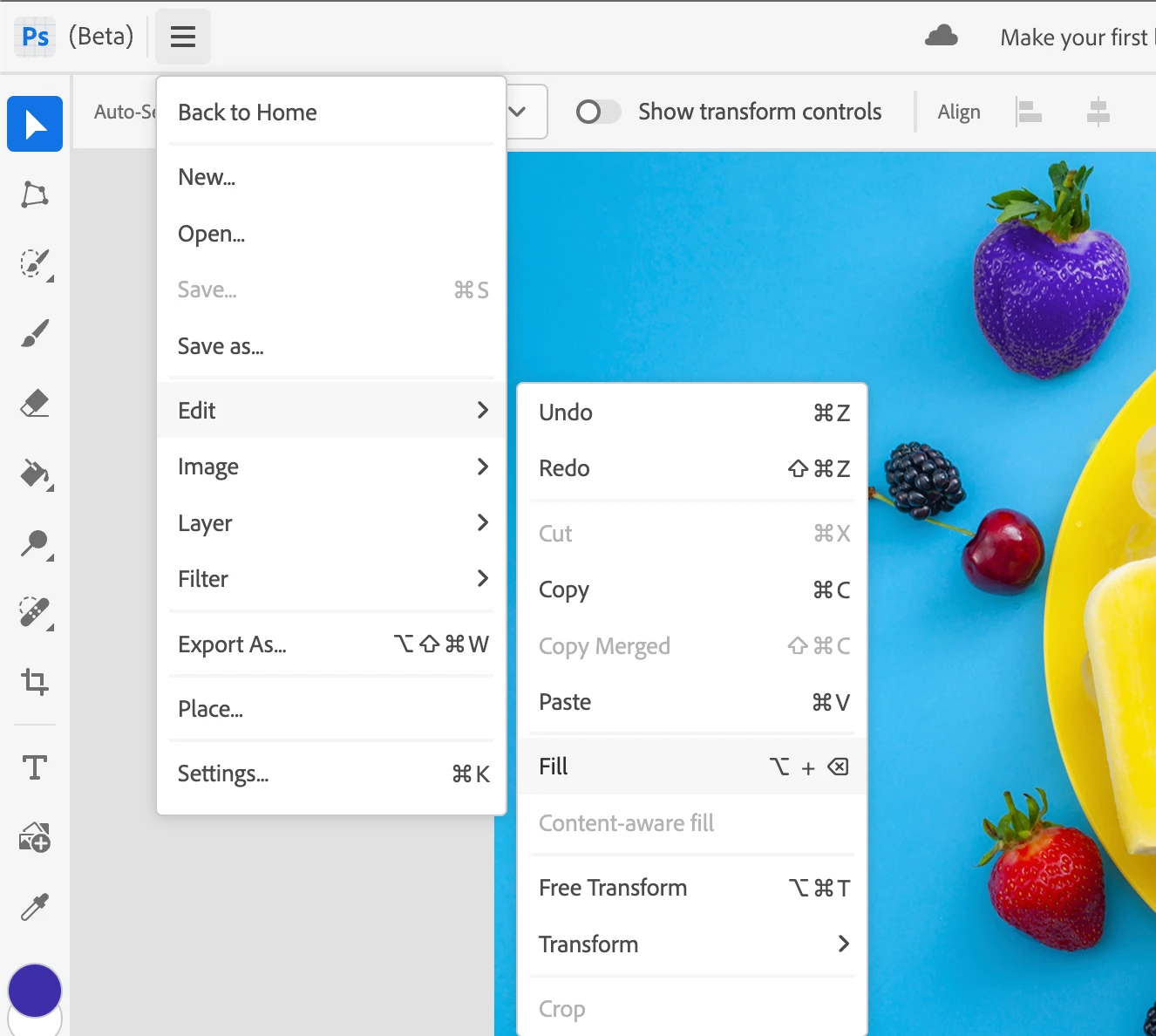 The keyboard shortcut for Fill is displayed as ⌥ + ⌫ in the Edit > Fill menu: