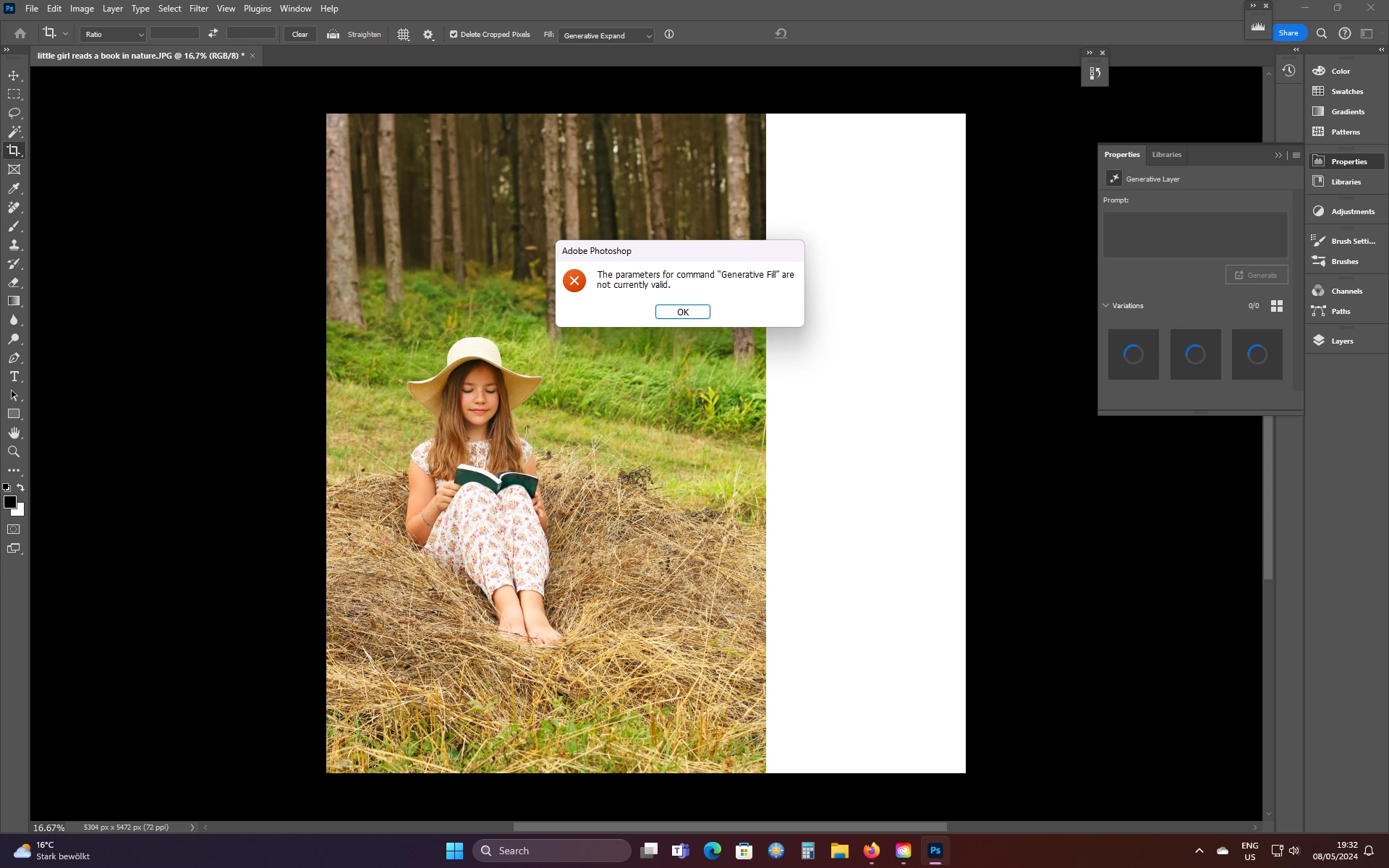 I was having a play with generative fill in photoshop (which was working), but when I tried generative expand with the crop tool like the tutorial, it came up with an error message saying "the parameters for command "Generative Fill" are not currently valid". I have updated, restarted the programme, reset preferences, restarted my computer, but still no luck. Has anybody encountered this and know of a solution? The only thing I can think of is that I am a teacher and am using a school Adobe account. But it will still let me use generative fill so I am not sure why it does one but not the other. Am I missing something glaringly obvious?