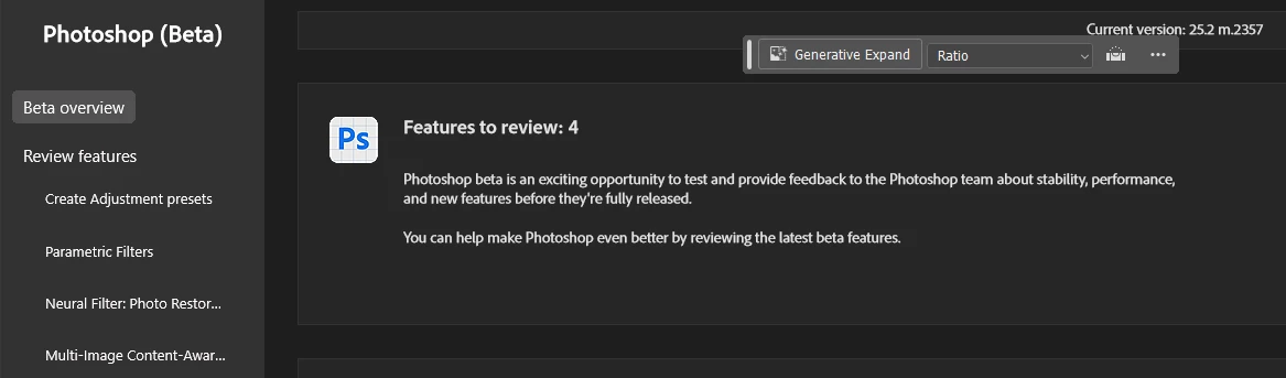 SSaid32885140h6x2ParticipantForum|Forum|2 years agoOctober 12, 2023QuestionGenerative fillForum|Forum|2 years agoOctober 12, 20231 reply259 viewsI downloaded the beta version of Photoshop and I still cannot find the generative fill option. Also, it says that I only have 4 features instead of 8.Desktop-Windows
