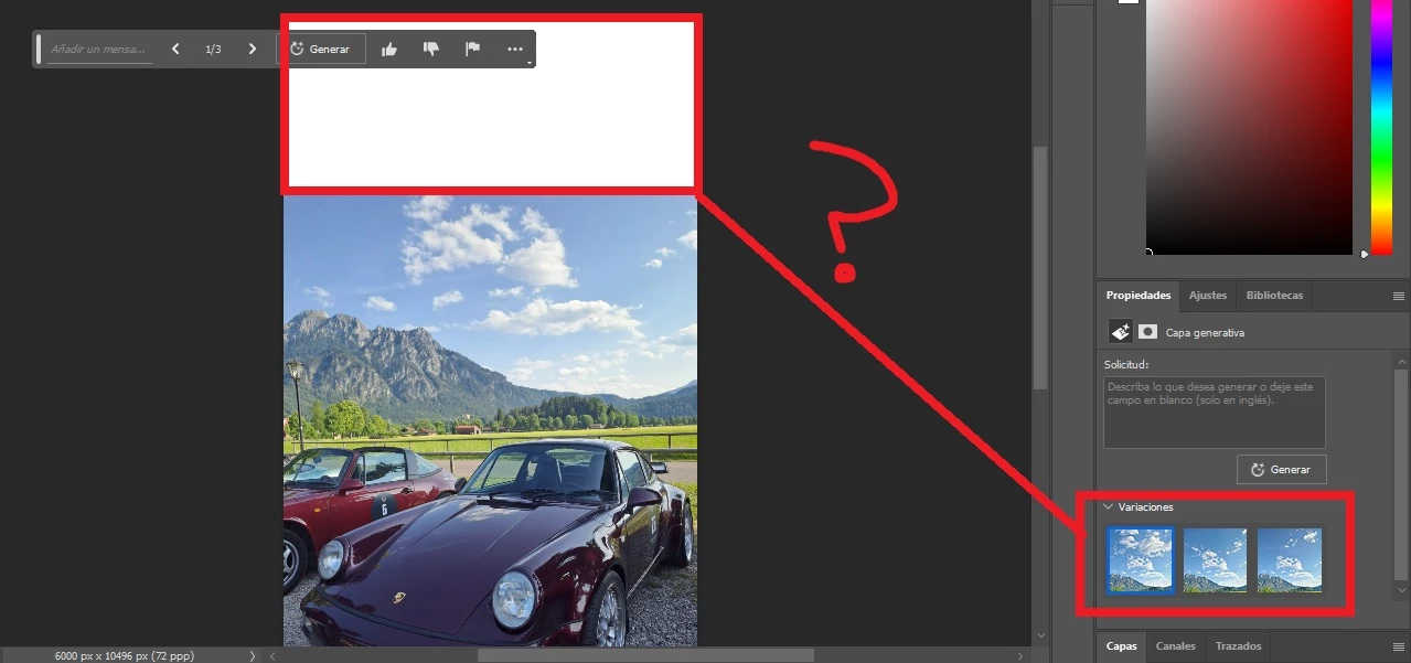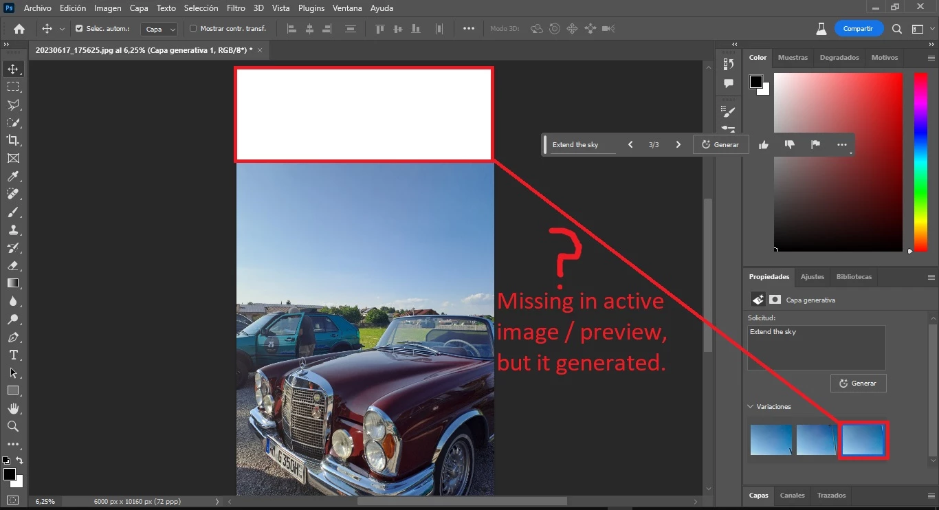 I have a bug where I use the generative fill features for example to generate more image to an image (make the image larger using AI) but it won't show on the active image / preview, but it will show on the generated variations (3).