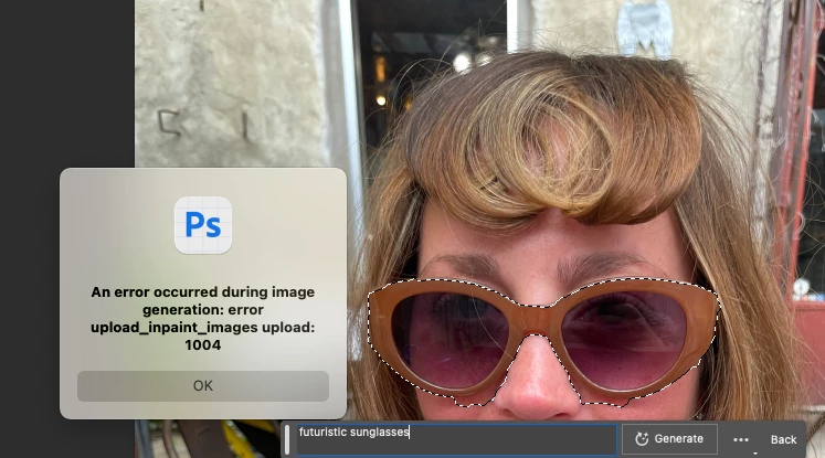 Strike 2 for me... I got Generative Fill to allow me to type the prompt (instead of the wondow being greyed out) after changing birthday to over 18. Now I'm getting this error after selecting an area to fill and typing in "Futuristic Sunglasses" -