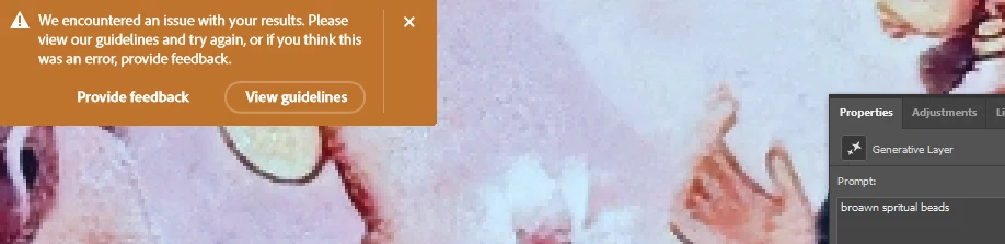 I don't know if anyone else is experiencing this, but as of the last few days, it seems like Generative Fill is constantly blocking results. Before it happened every so often, but now it's happening almost every single time. Perhaps it has something to do with the latest update? Has anyone else been experiencing the same problem?