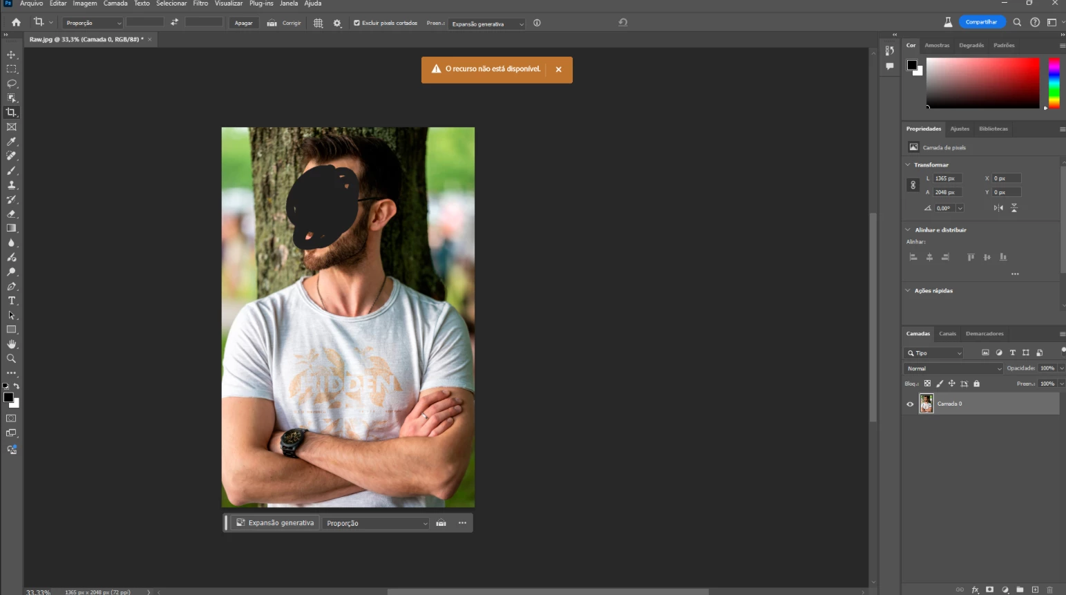 I have generative fill available to use, it appears in Photoshop, I crop the image, expand the margins and click on Generate Fill. The program processes it and gives a message, "The resource is not available".