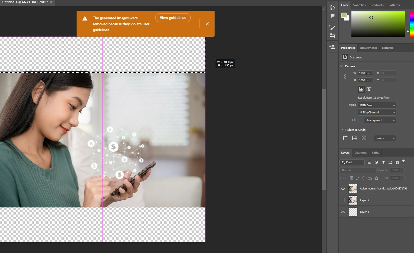 I'm trying to use generative fill on an iStock photo I purchased. It doesn't seem to violate any guidelines. Can someone explain why I might be getting a violation?