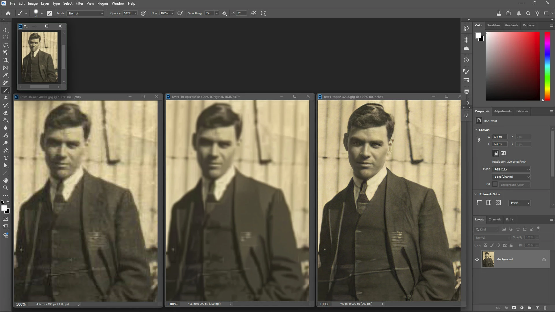 Original photo is at the top, then below from left to right is Image Resize 400%, Generative Upscale 4x and Topaz AI 3.3.3 (old now) Scaled 4x.