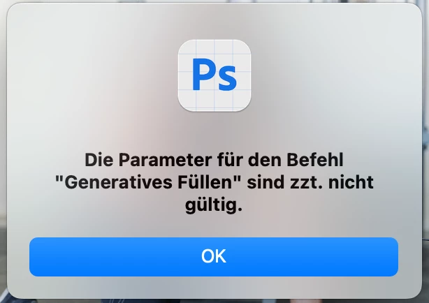 337207525dtabParticipantForum|Forum|1 year agoMay 6, 2024QuestionGeneratives Erweitern Fehlermeldung macOS SonomaForum|Forum|1 year agoMay 6, 20240 replies663 viewsBeim Versuch egal welches Foto generativ zu erweitern erhalte ich folgende Fehlermeldung: «Die Parameter für den Befehl "Generatives Füllen" sind zzt. nicht gültig.» Ich benutze die aktuellste Photoshop-Version 25.9.0 und macOS Sonoma 14.4.1Kann mir jemand helfen?Desktop-macOS