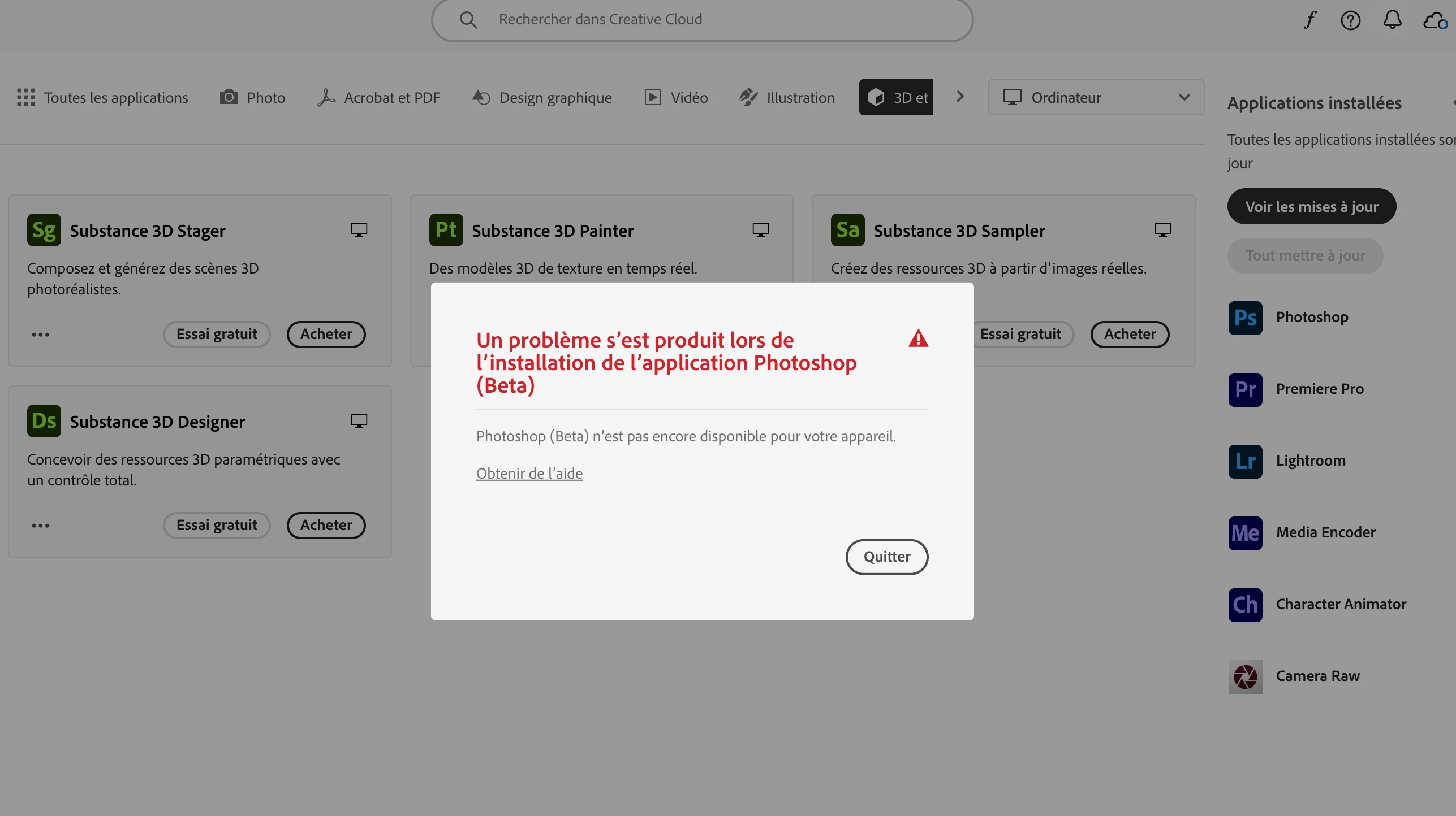 Impossible d'installer Photoshop Bêta