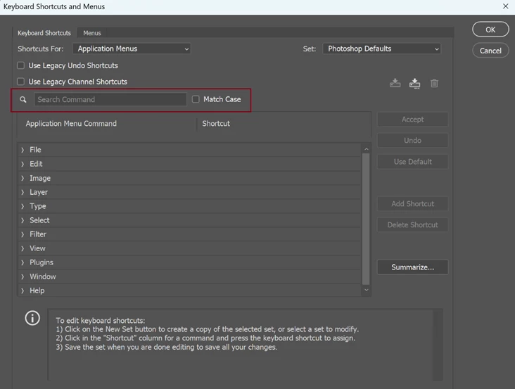 We have added a new capability that enables users to swiftly search for application menu commands and existing shortcuts. This enhancement allows for quick identification and effortless addition or modification of shortcuts, streamlining the process of finding commands and assigning new shortcuts for an optimized user experience. The search bar also makes it easier for users to find the desired function without needing to know its exact name, and users can now find functions using related terms.