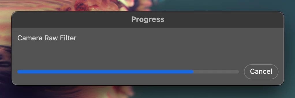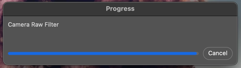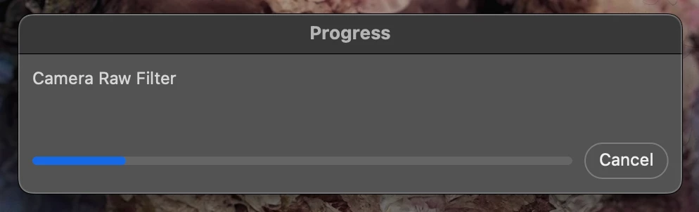 I don't think the Progress window is supposed to appear until you are done with Camera Raw Filter settings and click OK on the Camera Raw window. That's what usually happens, and that's when everything is working nice and smooth. For some reason, sometimes, seeminly randomly, the Progress window appears at the launch of Camera Raw, right after you have selected Camera Raw Filter from the Filter menu, and that's when it's game over.