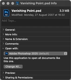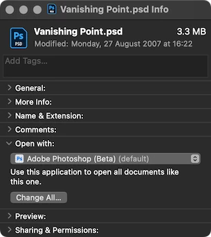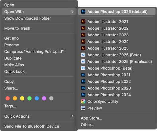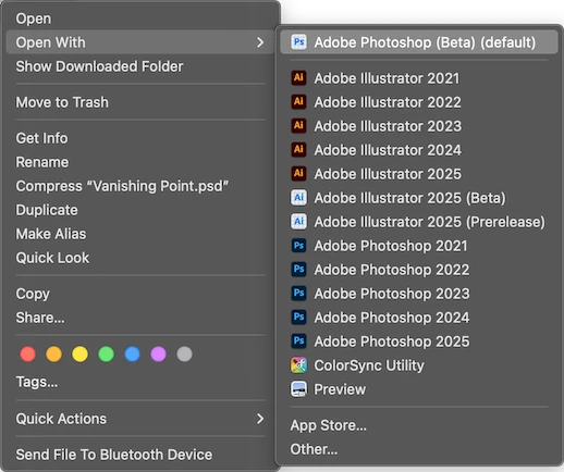 Behavior: With the beta (26.10) and release versions (26.9.0) installed, the default app for psds, psbs, and other file types previously asscoiated with the release version become associated with the beta by default.