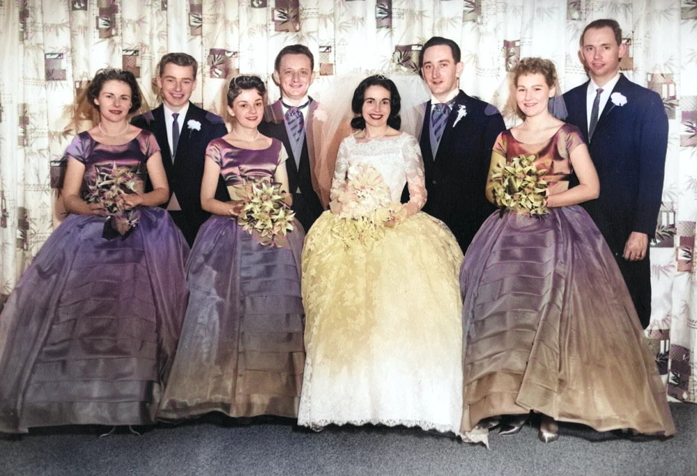 Although I wasn't there, I've seen my late Mom's wedding dress and I can assure you it was not yellow in any way. There is also a brown/yellow tinge to the purple dresses. While overall the Neural filter colorize is great, it still needs some work. Photoshop Beta 25.5.0 Windows 11 made from BW picture.