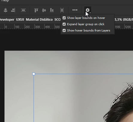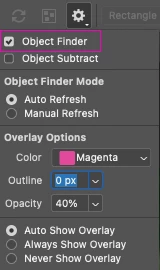 4. Select the Object Selection tool. Make sure “Object Finder” and “Auto Show Overlay” options in the gear dropdown on Options Bar are enabled.