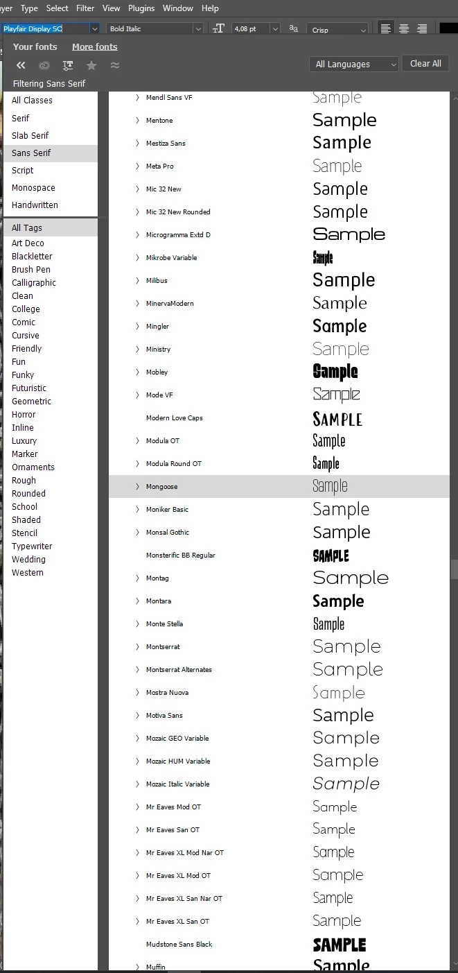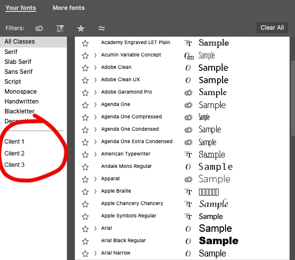 - Clear All button lets you remove any filters you've applied such as, Adobe Fonts, Font Class, additional Font Tags, Favorites, Similar, and Language filters.