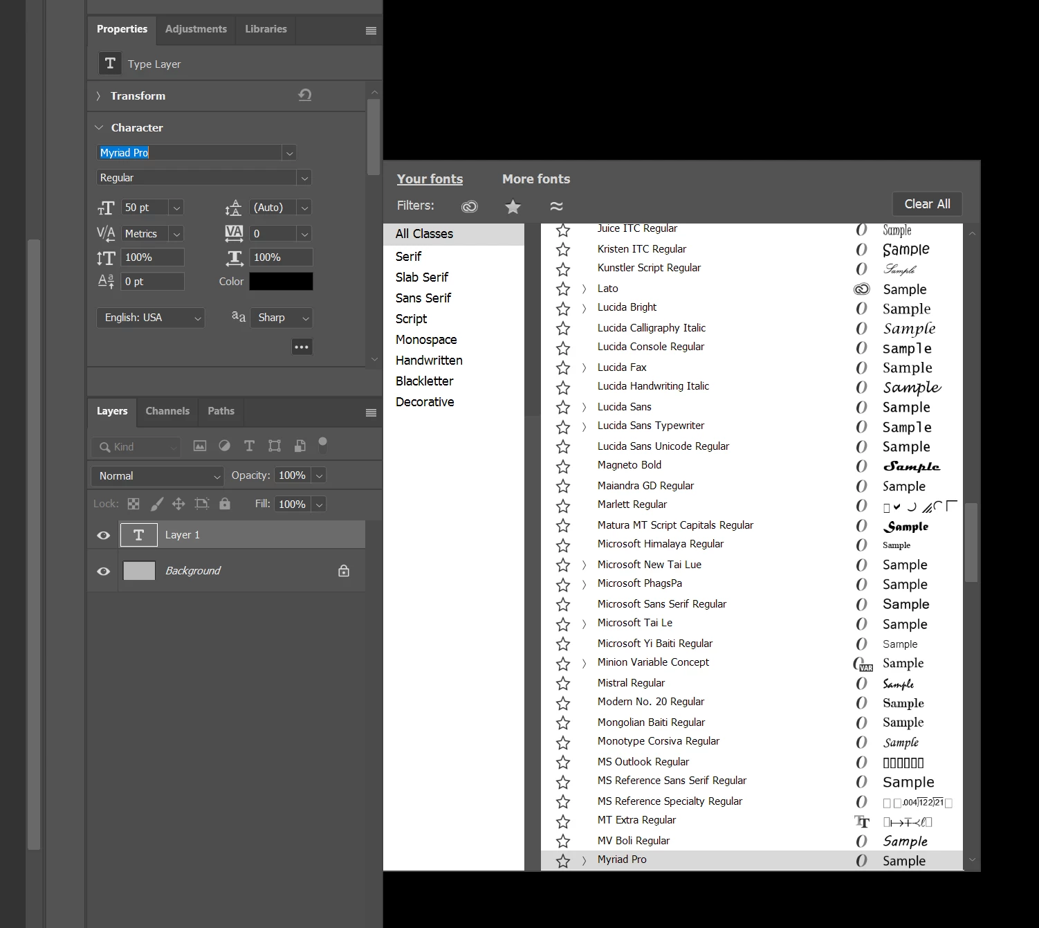 - “Your fonts” tab provides access to the currently installed fonts on your system or from Adobe Fonts.