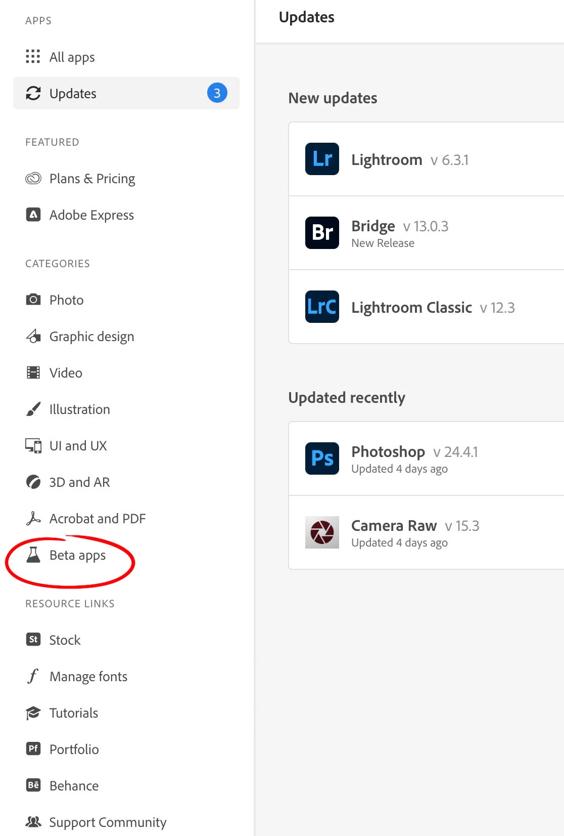 I would like to install the Beta versio of Photoshop but it does not show up in my "Categories" section on Creative Cloud? How do I get this option? I have the 2023 version of Photoshop. I am using a Macbook Air.