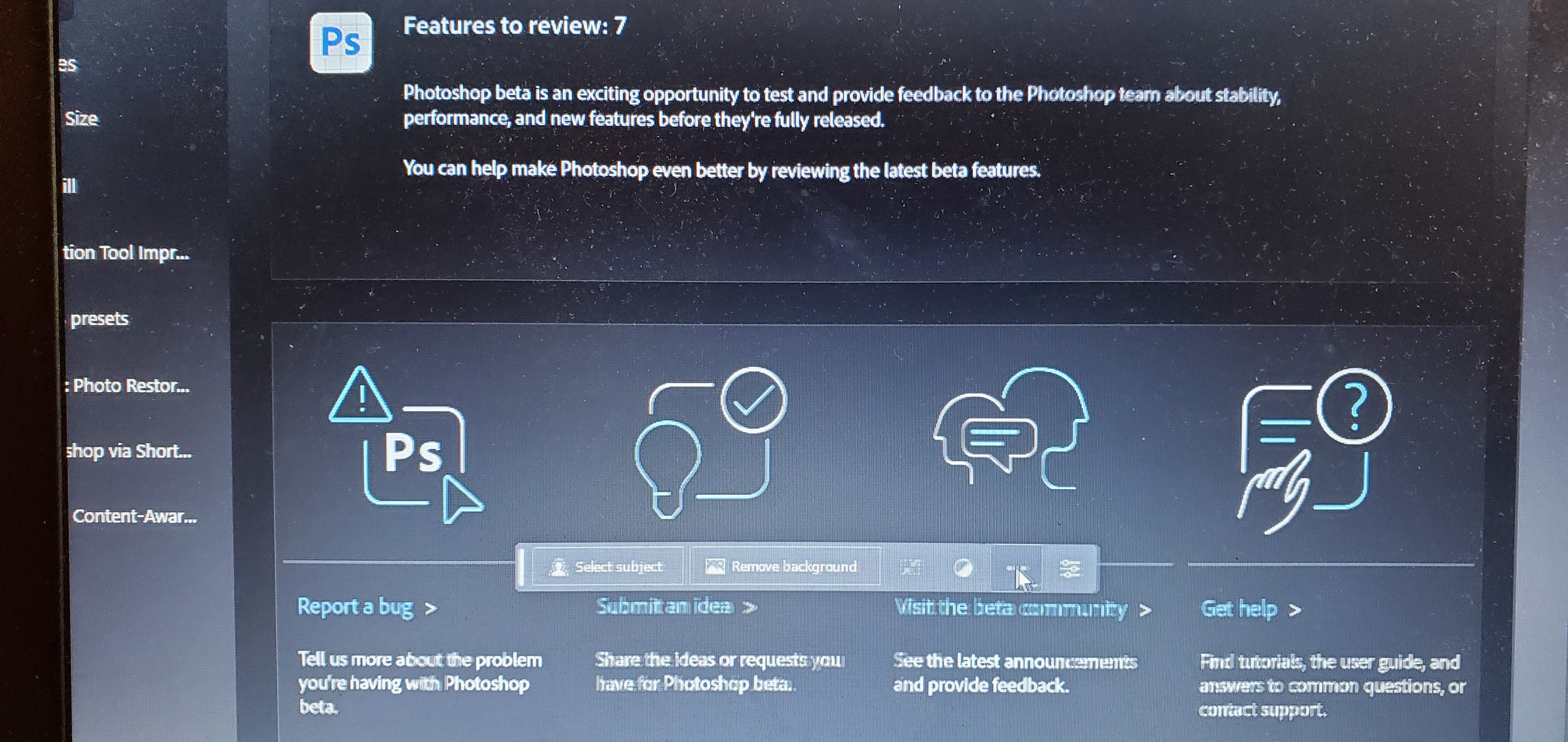 Hi @iuliana30710456ghju could you share a screenshot of your Ps beta workspace and an image that you are trying to use GF on? Make a selection and take a screenshot of what you see... are you on the latest version of Ps beta, Adobe Photoshop Version: 24.7.0 20230622.m.2215 26ae038 x64?