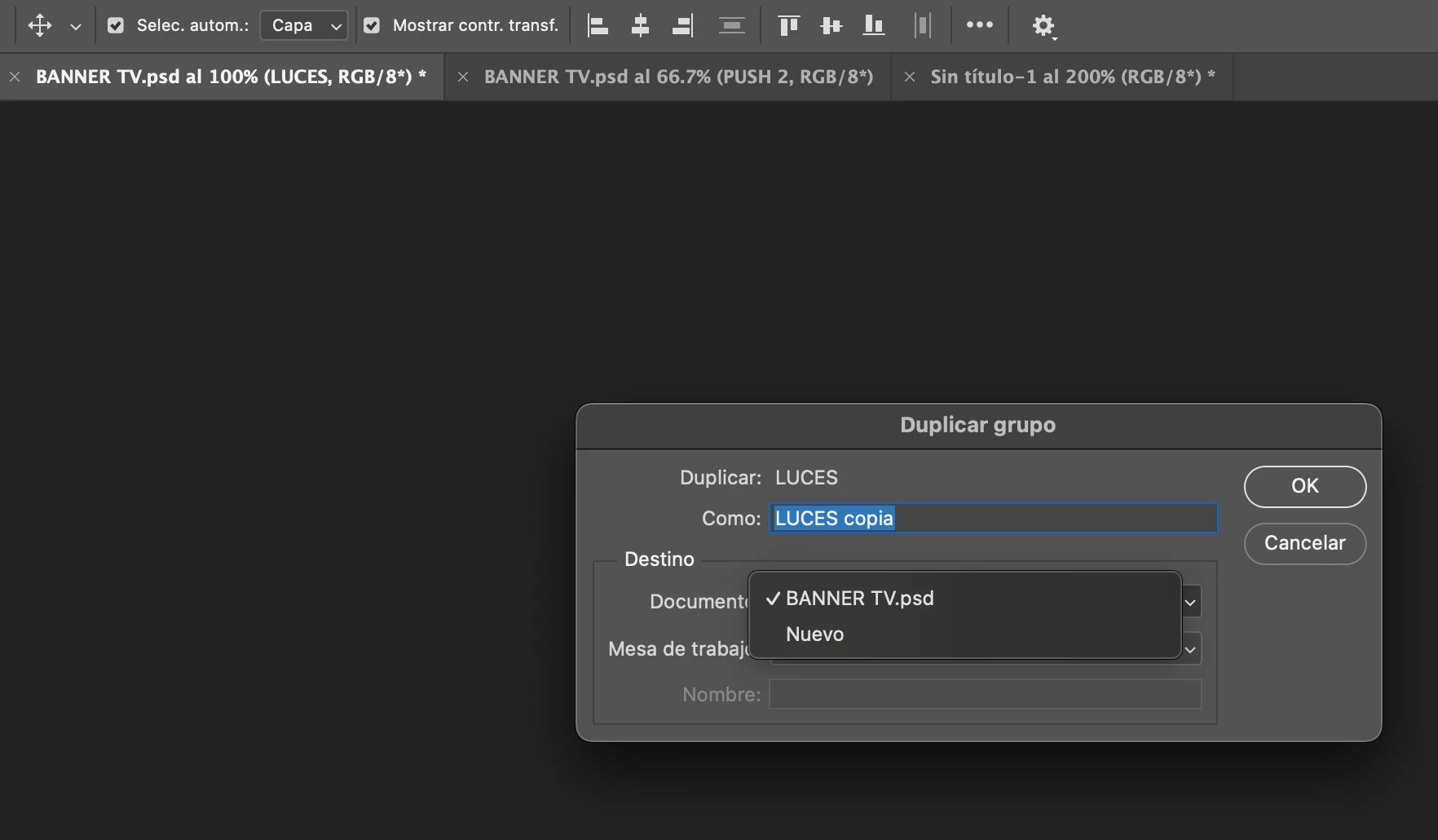 Quiero duplicar un grupo en otro documento de PSD pero no me aparece la opcion, como si no estuviera abierto.